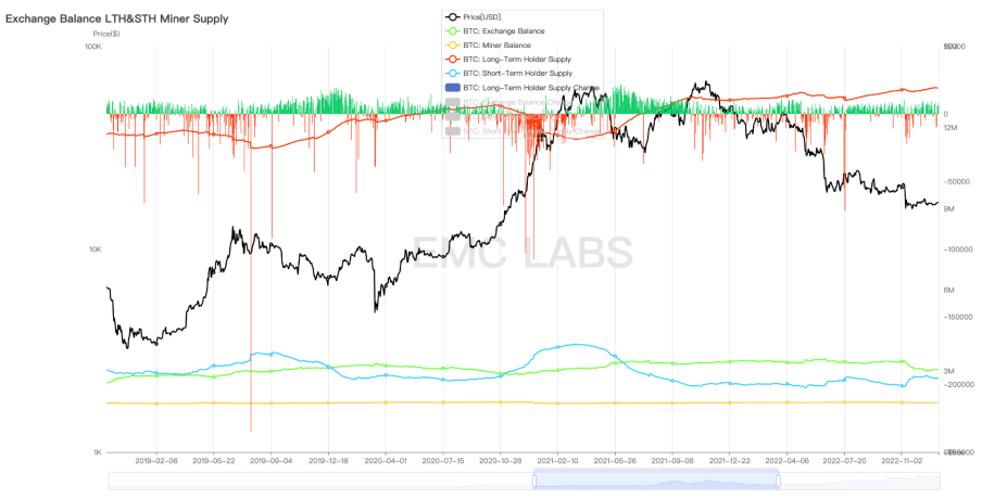 FTX等機構的破産加劇了市場見底,但決定周期終結的根本力量卻是長手群體(長期投資者)的止盈抛售。在市場狂熱時短手搶籌而長手抛售,在市場冷卻時短手抛售而長手轉而增持。