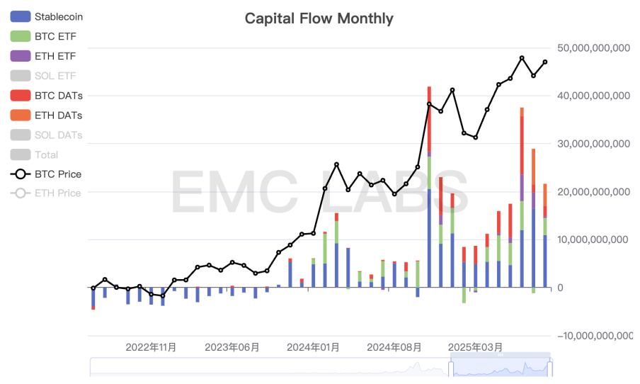 支持尚未見頂甚至走出新周期的因素包括:DATs公司突出的募資能力和長期持有策略、美國仍在推出和落地加密友好政策,以及降息周期重啓引發的高風險資産配置趨勢。