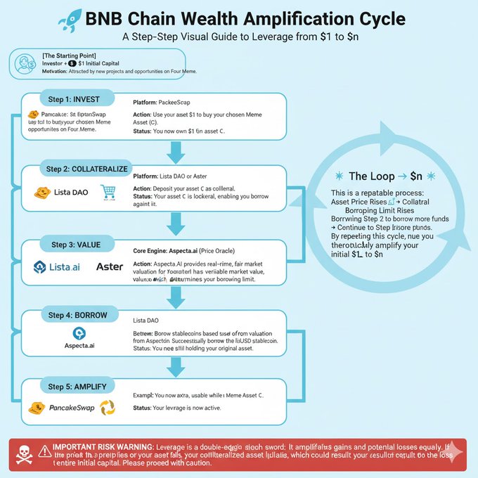 Four.Meme (入口) ➔ PancakeSwap/Aster (交易) ➔ Aster/Lista (加槓桿) ➔ PancakeSwap (再投資)
