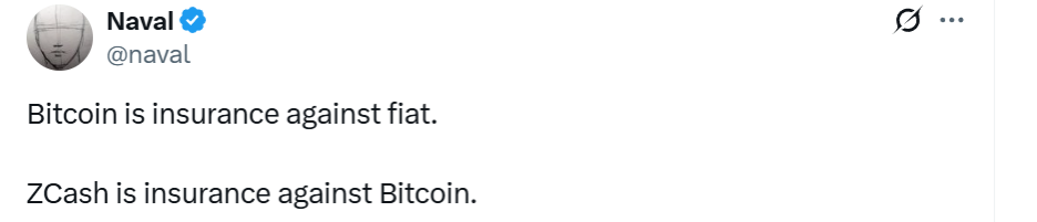 同日,矽谷知名天使投資人Naval在X平台上發佈了一段簡潔卻極富哲理的話,迅速在社區廣泛傳播:比特幣是針對法定貨幣的保險,ZCash 是針對比特幣的保險。Naval的“保險”論,賦予了Zcash在數字金融體係中作為“終極隱私保障”的全新定位。