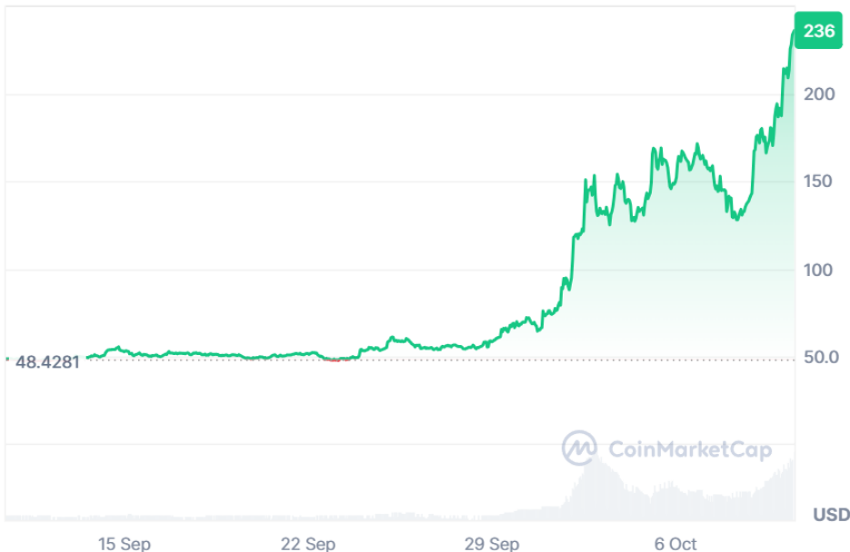 受機構情緒、Naval言論及減半事件三重驅動力的提振,$ZEC價格在短短一周内實現了井噴式上漲。截至10月10日,$ZEC 價格飙升超220%,一度觸及238.41美元的高點,打破了多年來的下行趨勢,重新吸引回全球投資者與交易員的目光。