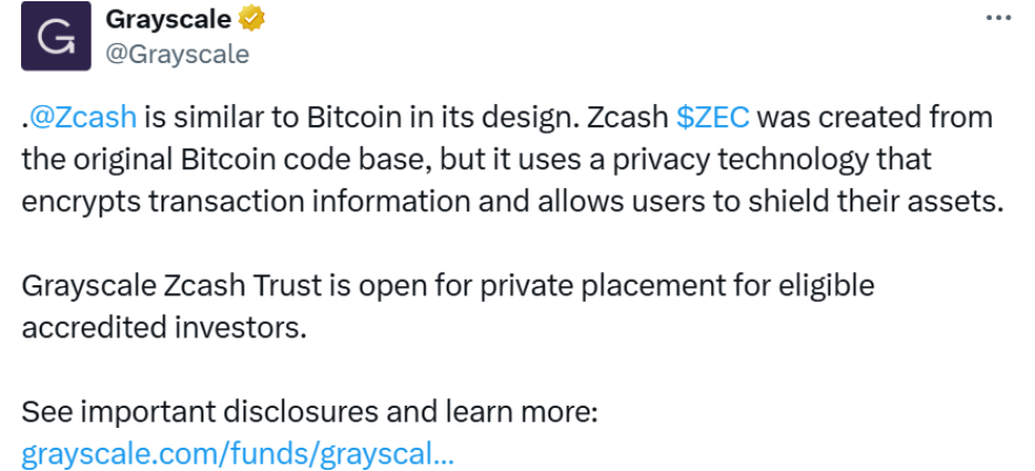 10月1日,灰度發佈公告,旗下Grayscale Zcash Trust(ZCSH)已面向合格投資者開放認購。 此舉標誌著機構資金對隱私資産領域的興趣再次升溫。