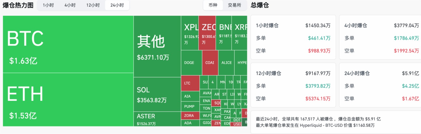 24小時爆倉數據:全球共167517人被爆倉 ,爆倉總金額為5.91億美元,其BTC爆倉1.63億美元、ETH爆倉1.53億美元、SOL爆倉3563.82萬美元