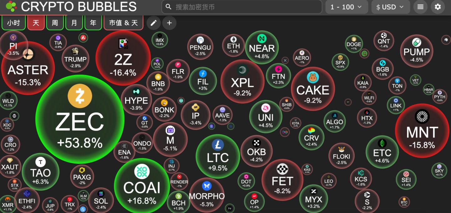 今日市值前100幣種最大漲幅:Zcash漲53.8%、ChainOpera AI漲16.8%、Litecoin漲9.5%、Bittensor漲6.3%、NEAR Protocol漲4.8%。