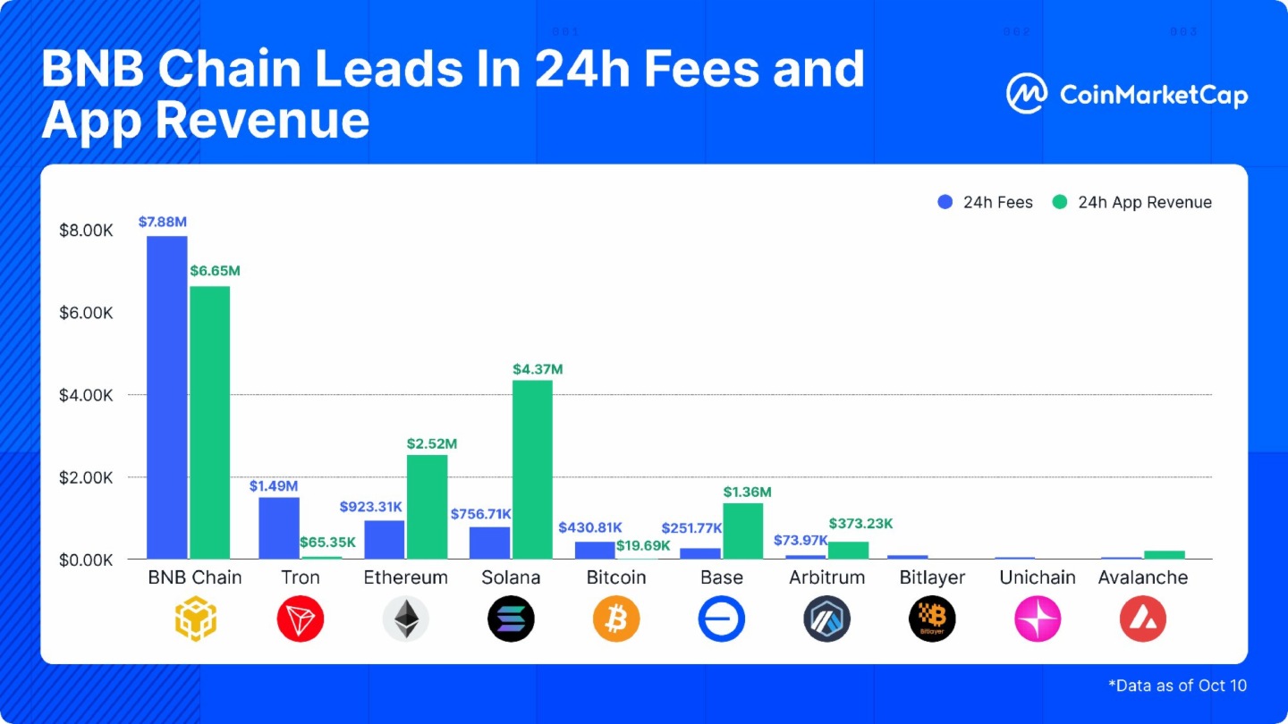 PANews 10月10日消息,據CoinMarketCap數據顯示,BNB Chain在過去24小時内以788萬美元的手續費和665萬美元的應用收入位居榜首。其他主要區塊鏈表現依次為:Solana(應用收入437萬美元)、Ethereum(應用收入252萬美元)和Tron(手續費收入149萬美元)。