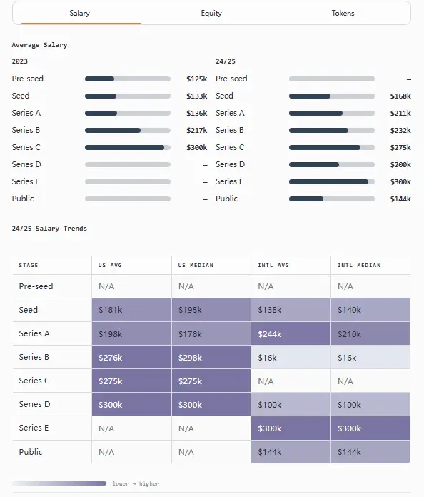 按發展階段劃分,預期的模式依然成立:早期公司提供的薪資較低,但股權更多(通常是兩倍),而後期團隊則相反。代幣總體上變得不那麼常見,但在市場推廣(GTM)、産品和高級國際職位中仍具有重要意義。