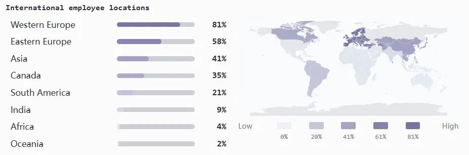 全球優先是默認模式,大多數團隊從第一天起就跨國招聘。普遍而言,人才獲取和靈活性比地理位置更重要。