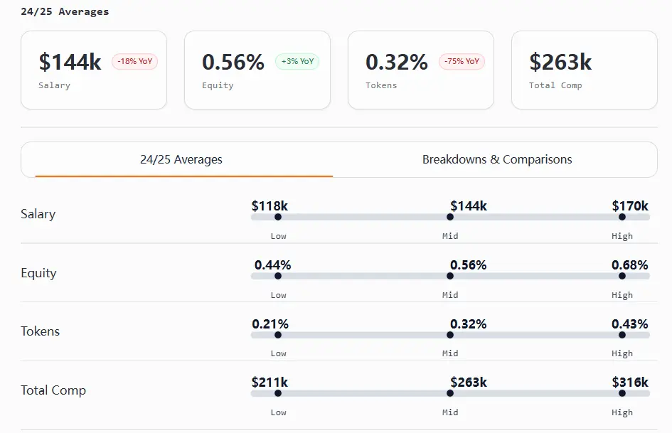 總體而言,2024 年和 2025 年初的加密行業薪酬處於下行市場,與傳統行業相比,其薪酬體係仍相對不成熟。