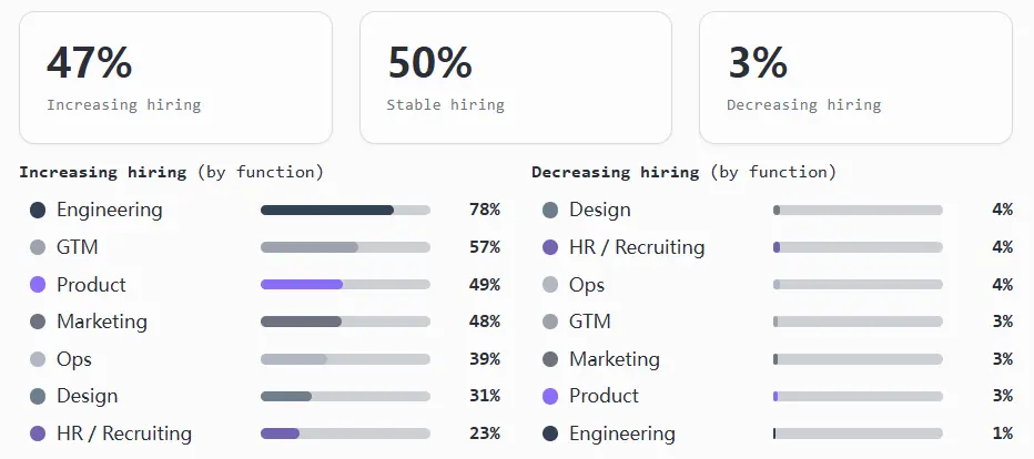 大多數團隊處於目標增長模式,而非超速增長。總體而言,公司在精簡支持團隊的同時,選擇性地擴充核心團隊,許多公司有意維持員工人數不變,很少有公司計劃整體減少人員數量。