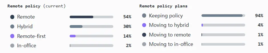 加密行業仍以遠程工作為主,大多數公司採用完全分佈式辦公模式。其次是混合模式,將遠程工作與強制到辦公室工作相結合。遠程優先(可選擇是否在辦公室辦公)模式佔據了較小的中間地帶,很少有公司完全在辦公室辦公。