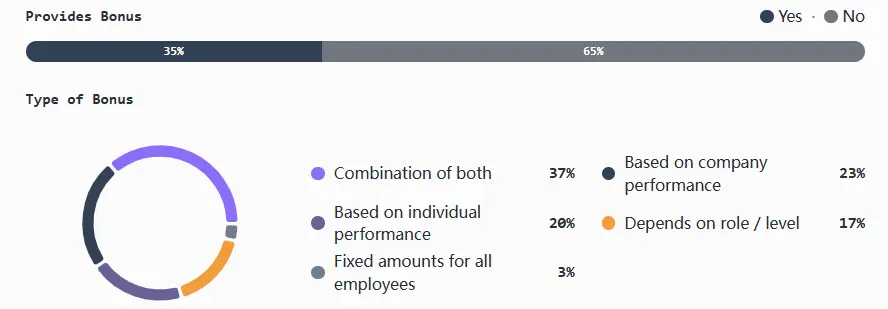 在存在獎金的情況下,獎金通常與公司和個人績效(混合)掛鈎。僅與公司掛鈎、僅與個人掛鈎以及基於職位/級別的模式不太常見,固定獎金也很少見。