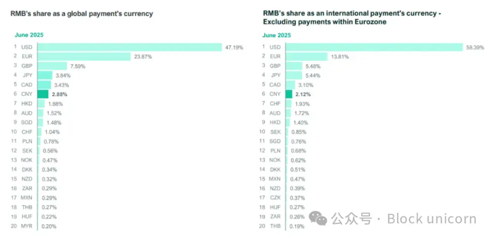 面對美元主導地位的增強,中國加大了在穩定幣領域的投入,以推動人民幣國際化。人民幣目前僅佔全球支付總額的約 2.9%。中國的主要工作重點仍然是推廣其央行數字貨幣(CBDC)——數字人民幣(e-CNY),旨在增強貨幣主權,減少對以美元為基礎的國際金融體係的依賴。