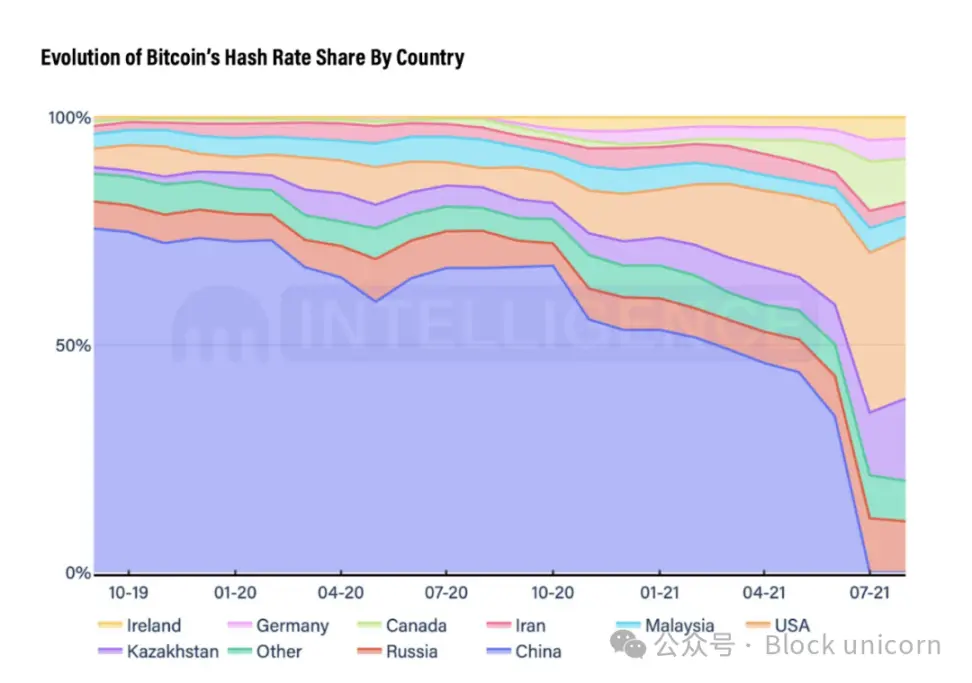 2021 年,監管力度進一步升級,在最初的監管基礎上,2021 年 5 月,金融機構和支付公司被禁止提供與加密貨幣相關的服務。2021 年 6 月,内蒙古、新疆和四川等主要挖礦中心出台了一項打擊比特幣挖礦活動的措施,理由是電力消耗對環境造成影響。此次打擊導致中國大型比特幣挖礦公司大批遷往哈薩克斯坦和俄羅斯等鄰國,這些國家目前佔據了全球算力的很大份額。