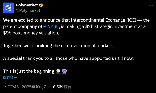 2025 年 10 月 7 日,預測市場 Polymarket 官宣紐約證券交易所母公司洲際交易所(ICE)將對其進行 20 億美元的戰略投資,投後估值高達 90 億美元,這不僅是近年來 Web3 領域項目獲得的最高融資額之一,更將預測市場的潛力與熱度推至舞台中央。