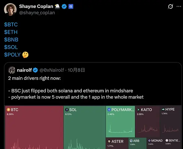 這也很可能和最新的 20 億美元巨額融資是一個組合拳,且 Polymarket 首席執行官 Shayne Coplan 在 10 月 9 日也發佈帶有 POLY 符號的推文,可能成為兩雄競爭的關鍵變量。