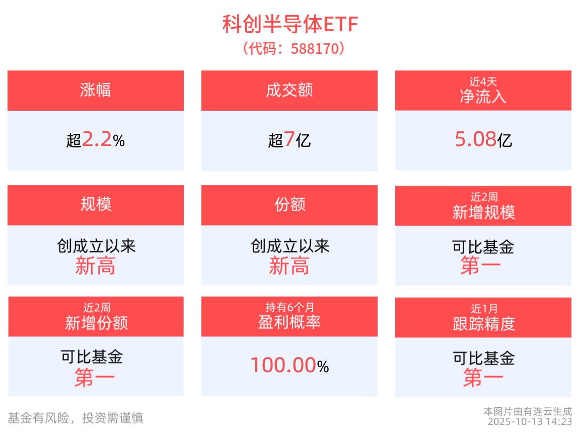 截至2025年10月13日 14:23,上證科創板半導體材料設備主題指數(950125)強勢上漲2.49%,成分股富創精密(688409)上漲9.19%,滬矽産業(688126)上漲9.02%,中科飛測(688361)上漲8.41%,龍圖光罩(688721),芯源微(688037)等個股跟漲。科創半導體ETF(588170)上漲2.26%,最新價報1.54元。拉長時間看,截至2025年10月10日,科創半導體ETF近2周累計上漲1.90%。