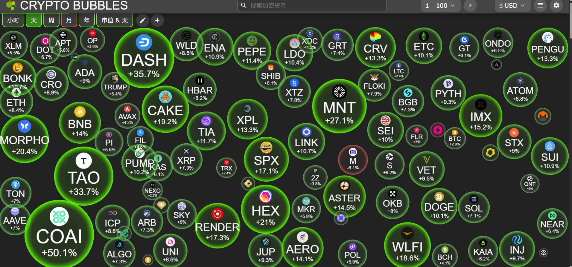 今日市值前100币种最大涨幅:COAI涨53.8%、DASH涨35.7%、TAO涨33.7%、MNT涨27.1%、HEX涨21%。