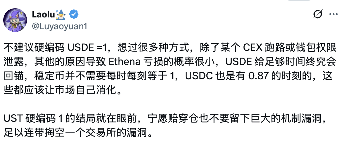 這次 USDe 脫錨事件,也暴露了穩定幣設計理念與槓桿生態之間的張力。Laolu 認為,穩定幣不應被硬性錨定為 1,而應依靠市場機制和套利機制逐步回歸。即使短時間出現偏離,USDe 仍有足夠的時間和機制回錨,市場最終會自我修復。硬性設定 1 反而可能埋下係統性漏洞,一旦極端市場波動出現,就會像 UST 那樣,引發連鎖爆倉。