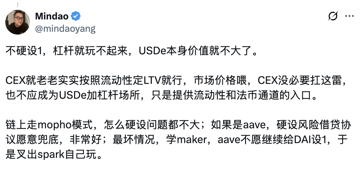 另一方面,Mindao 指出,如果穩定幣不能維持在 1 附近,其價值作為抵押物和槓桿資産的可預測性就會大幅下降,槓桿、借貸等産品將難以正常運作。在中心化交易所這種以槓桿和借貸為核心的環境中,硬設 1 是一種工程妥協:它為用戶提供可預期的價值基準,保證抵押和清算機制能夠順利執行。