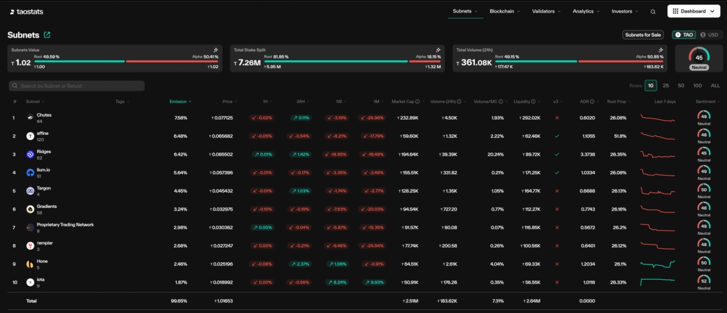 動態 TAO(dTAO)的引入從根本上改變了生態係統的運作機制。每日 TAO 發行量的分配權完全從根驗證者(子網 0,批評者稱其為寡頭投票係統)手中轉移,轉而由每個子網的 alpha 代幣的市場價格來決定。每個挖礦子網都獲得了自己的 alpha(α)代幣以及自己的自動做市商(AMM)池,。這意味著每個子網都能夠發展出獨立的、由資本驅動的經濟。質押方式從 TAO 委託給單個驗證者(子網 0 質押)轉變為購買並質押特定於子網的 alpha 代幣(α)。質押者現在承擔市場風險,但可以直接影響資源分配。礦工和驗證者之間原本僵化的五五獎勵分配演變為當前的 41/41/18 分配,以更好地資助子網所有者(18%)並激勵子網核心激勵機制的持續創新。