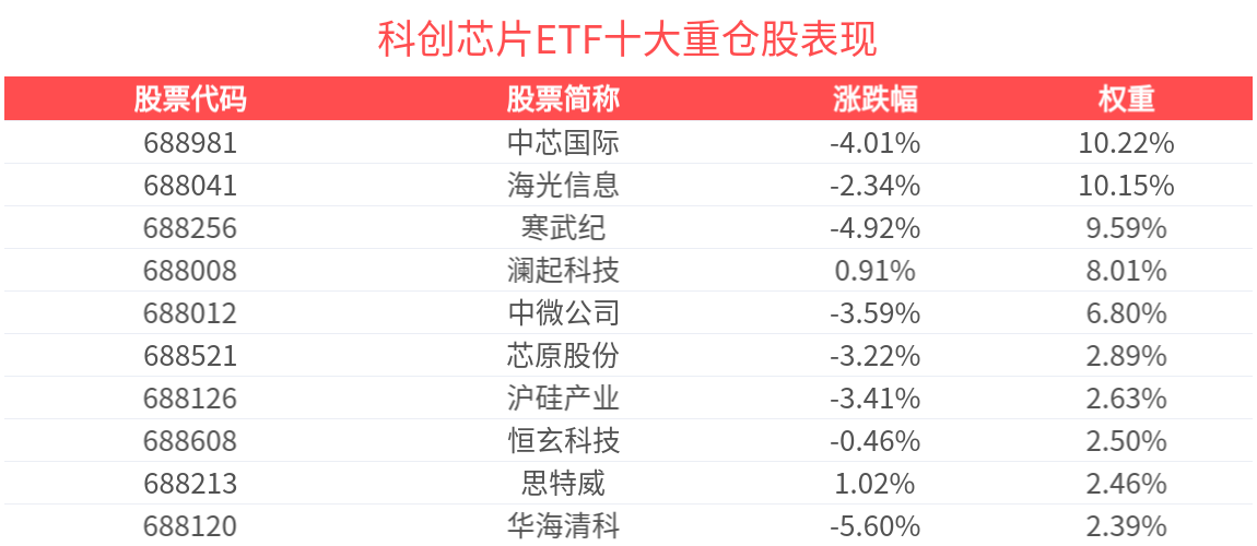 顯示,截至2025年9月30日,上證科創板芯片指數前十大權重股分別為海光信息、瀾起科技、中芯國際、寒武紀、中微公司、芯原股份、華虹公司、滬矽産業、華海清科、晶晨股份,前十大權重股合計佔比59.69%。
