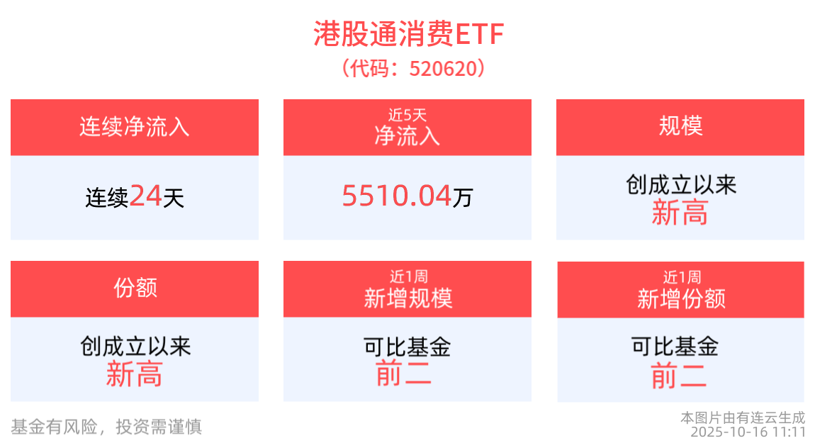 規模方面,港股通消費ETF最新規模達4.32億元,創成立以來新高。份額方面,港股通消費ETF最新份額達4.40億份,創成立以來新高。資金淨流入方面,港股通消費ETF近24天獲得連續資金淨流入,最高單日獲得5158.96萬元淨流入,合計「吸金」2.65億元。