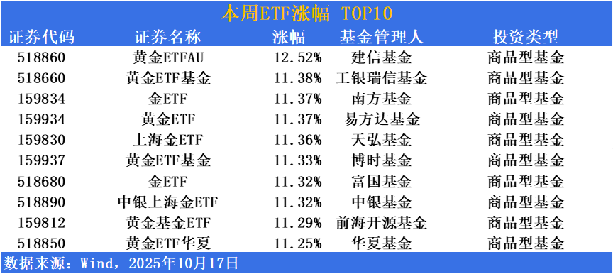 具體來看,得益於美聯儲降息刺激與市場避險情緒的發酵,現貨黃金價格勢如破竹,在10月17日亞洲交易時段逼近4400美元/盎司大關,連續刷新歷史峰值,漲幅前十的ETF中被黃金賽道所佔領。其中黃金ETFAU(518860)漲幅超12%位居榜首,黃金ETF基金(518660)、金ETF(159834)等多支黃金ETF基金漲超11%。