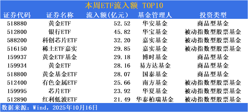 本期(2025年10月13日-10月16日),美聯儲降息預期、貿易摩擦升級與區域政治風險交織,共同推升黃金避險與配置需求。短綫雖處超買區間,但波動率提升更多體現情緒擴張而非趨勢反轉,中期多頭邏輯仍穩固。黃金ETF興業(518880)流入超50億,領跑市場。銀行ETF(512800)流入超40億位居次席,科創芯片ETF(588200)流入超30億,位居流入榜第三,流入榜前十大ETF多數涉及避險資産。