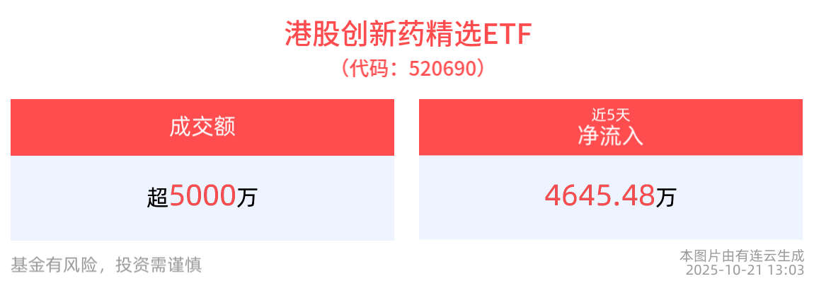 截至2025年10月21日 13:03,恒生港股通創新藥精選指數上漲0.89%,成分股雲頂新耀上漲5.48%,再鼎醫藥上漲3.43%,四環醫藥上漲2.72%,三生制藥上漲2.70%,山東新華制藥股份上漲1.77%。港股創新藥精選ETF(520690)上漲0.85%,最新價報0.95元。拉長時間看,截至2025年10月20日,港股創新藥精選ETF本月以來累計上漲1.41%。