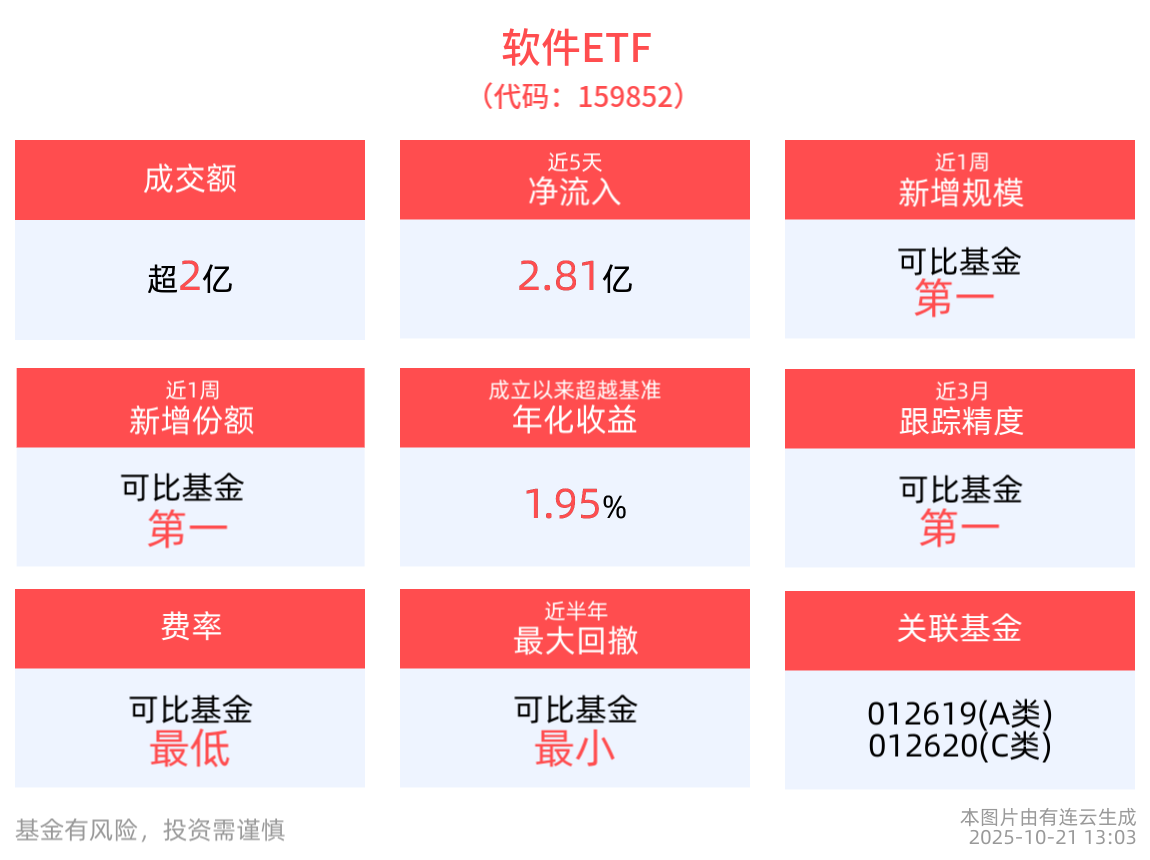 截至10月20日,軟件ETF近3年淨值上漲14.41%。從收益能力看,截至2025年10月20日,軟件ETF自成立以來,最高單月回報為39.35%,最長連漲月數為3個月,最長連漲漲幅為69.40%,上漲月份平均收益率為10.06%。