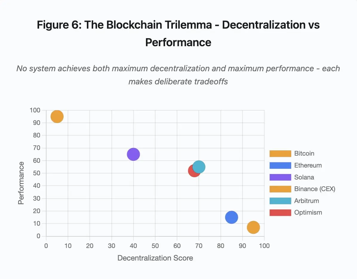 核心洞见: 没有系统能同时实现最大程度的去中心化和最高性能。每种设计都为不同的用例做出了刻意的权衡。