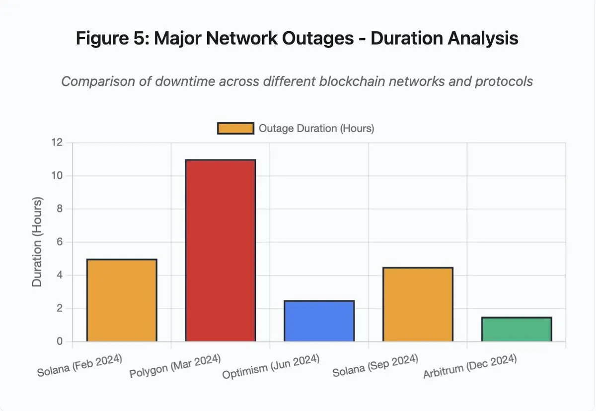 Solana在2024-2025年间经历了多次中断。2024年2月的中断持续了约5小时,9月的中断持续了4-5小时。这些中断源于相似的根本原因:网络在遭受垃圾交易攻击或极端活动时无法处理交易量。