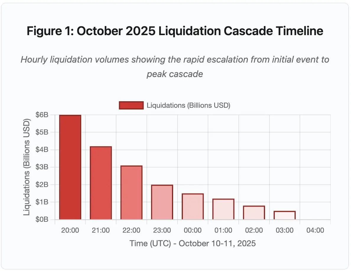 这场发生于2025年10月10日至11日的清算连锁事件,成为基础设施失效机制的典型案例。UTC时间10月10日20:00(北京时间10月11日4:00),一项重大地缘政治公告引发市场普遍抛售。在短短一小时内,清算规模高达60亿美元。当亚洲市场开盘时,杠杆头寸的总体蒸发额已达193亿美元,波及160万名交易者账户。