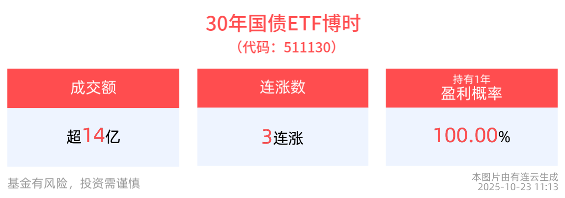 截至2025年10月23日 11:13,30年國債ETF博時(511130)上漲0.04%, 沖擊3連漲。最新價報107.24元。拉長時間看,截至2025年10月22日,30年國債ETF博時近1周累計上漲1.31%。