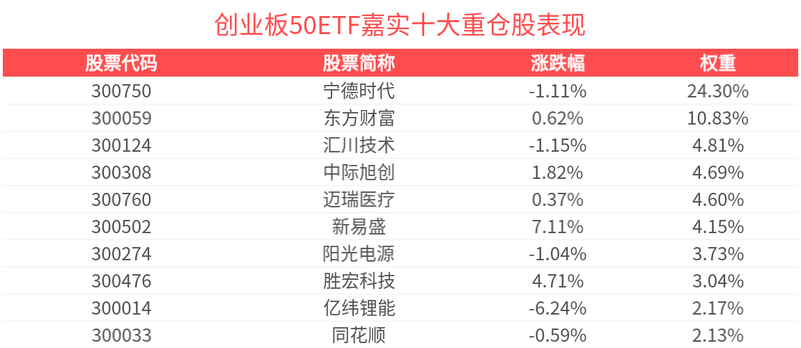 數據顯示,截至2025年9月30日,創業板50指數前十大權重股分別為寧德時代、中際旭創、東方財富、新易盛、陽光電源、勝宏科技、匯川技術、邁瑞醫療、億緯鋰能、同花順,前十大權重股合計佔比69.36%。
