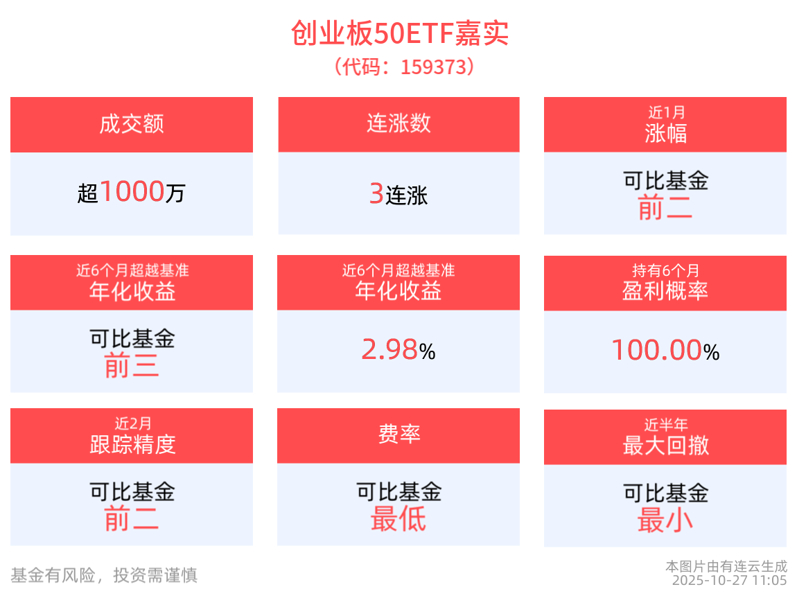 截至10月24日,創業板50ETF嘉實近6月淨值上漲79.12%,居可比基金前3,指數股票型基金排名46/3780,居於前1.22%。從收益能力看,截至2025年10月24日,創業板50ETF嘉實自成立以來,最高單月回報為27.79%,最長連漲月數為5個月,最長連漲漲幅為80.37%,上漲月份平均收益率為11.10%。