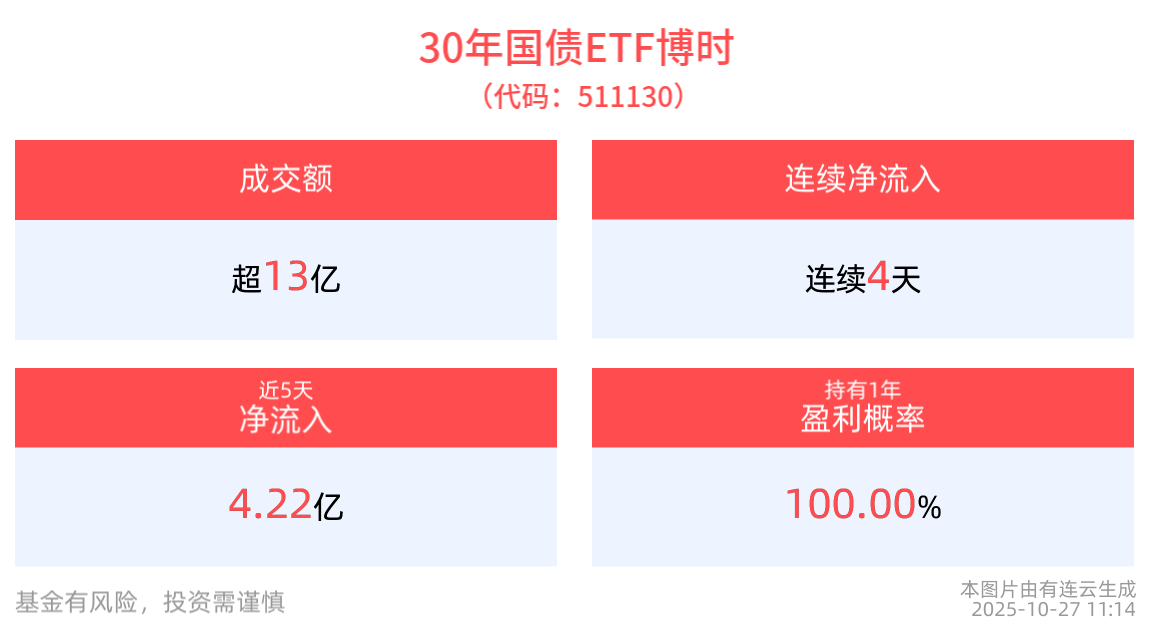 從資金淨流入方面來看,30年國債ETF博時近4天獲得連續資金淨流入,最高單日獲得1.66億元淨流入,合計「吸金」4.46億元,日均淨流入達1.12億元。