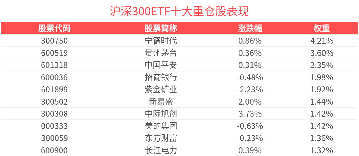 數據顯示,截至2025年9月30日,滬深300指數前十大權重股分別為寧德時代(300750)、貴州茅台、中國平安、招商銀行、紫金礦業、新易盛、中際旭創、美的集團、東方財富、長江電力,前十大權重股合計佔比21.49%。