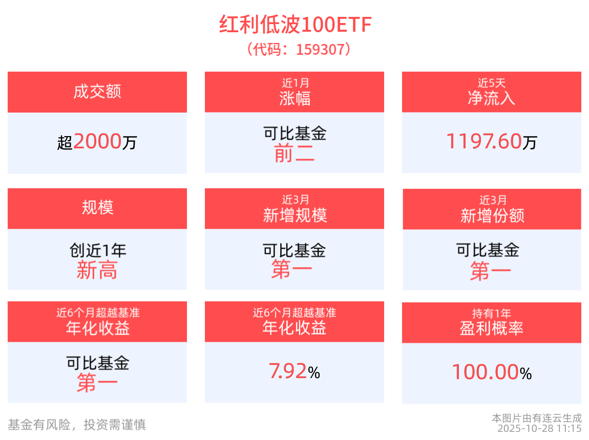 流動性方面,紅利低波100ETF盤中換手1.54%,成交2249.04萬元。拉長時間看,截至10月27日,紅利低波100ETF近1月日均成交2225.76萬元,居可比基金前2。