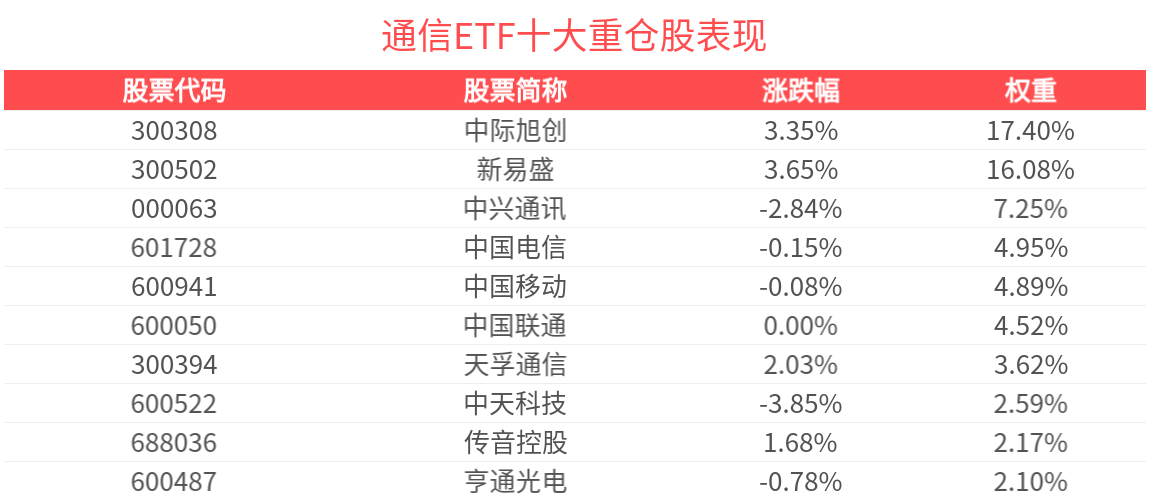 數據顯示,截至2025年9月30日,國證通信指數前十大權重股分別為中際旭創、新易盛、中興通訊、中國電信、中國移動、中國聯通、天孚通信、中天科技、傳音控股、亨通光電,前十大權重股合計佔比66.02%。