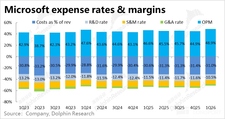 本季微軟的毛利率為69%,雖然確實同比下降了0.4pct,但比彭博預期高出了整整1.5pct。同時,經營三費合計同比增長僅4.9%,相比上季的5.8%繼續收窄,也遠低於營收和毛利潤約18%的增速,從而費用率佔收入比重同比來看被攤薄了整整2pct