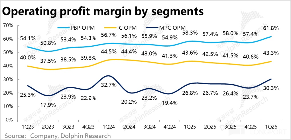 4)分板塊來看,本季各個板塊的利潤率全面環比走高。其中承擔了最多Capex和折舊的智慧雲板塊也靠著優秀的控費,經營利潤率環比提升了2.7pct。而因提價和業績觸底的生産力與個人計算板塊,在毛利率上就是同比提升的,再疊加優秀的控費,經營利潤率提升的幅度就更高了。