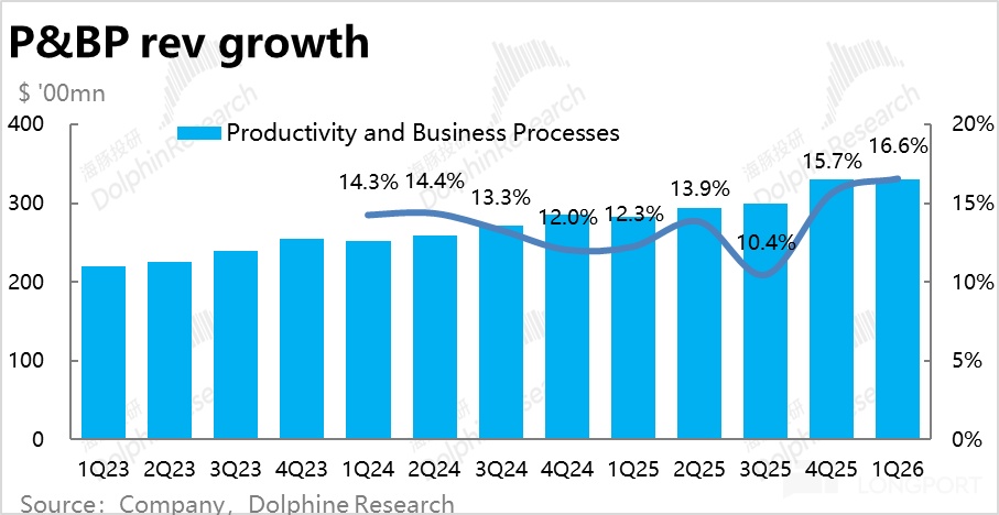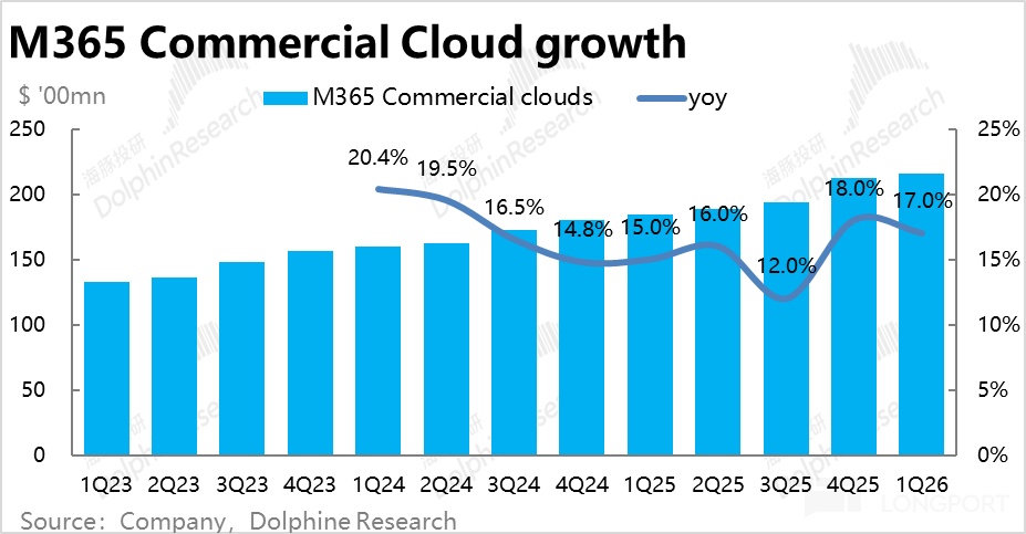 整體上,雖然核心商用M365業務增長平穩中略降,但在消費M365強勁提速增長的拉動下,本季生産力流程板塊的整體的營收增速為16.6%,較上季小幅提速,且同樣小超彭博預期2.3%。