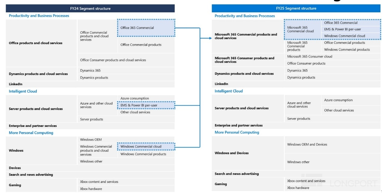 25財年開始微軟對財報披露的部門結構做出不小的調整。整體的調整思路是把面向企業的各類365服務,包括Commercial Office 365, Windows 365和Security 365,全部從各自原板塊調整到生産力&流程(PBP)大板塊下。在25新財年首次調整時,海豚投研對此已較詳細的解讀,就不在每次財報中重復筆墨。下圖簡要概括了此次調整的變化。對口徑調整更詳細的看法請見1Q25點評。