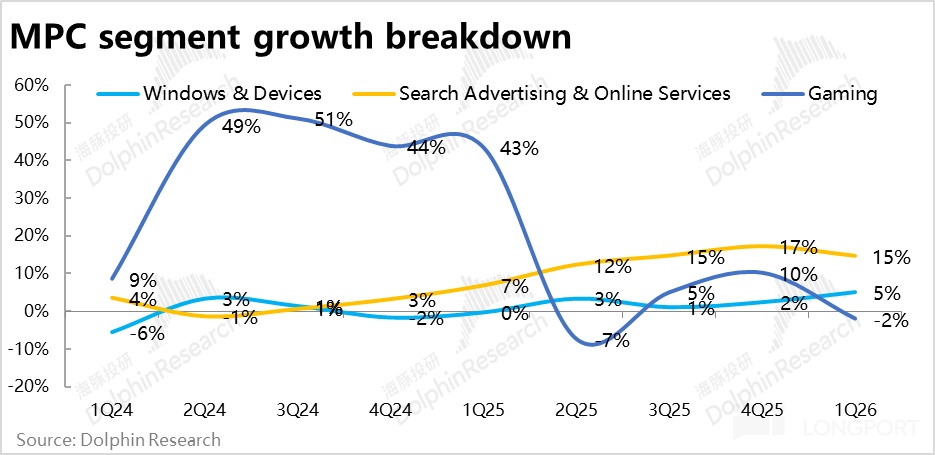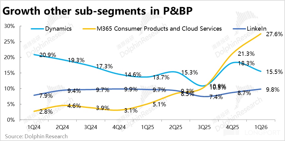 生産力板塊中的其他業務, LinkedIn的收入增速在低位保持平穩,而Dynamics的增長在上季的「暫時」高點後也再度回落,沒有特別值得關注之處。