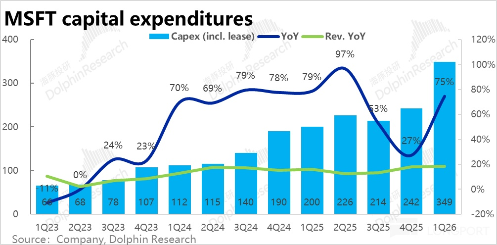 雖然業績前,市場已普遍預期微軟本季的Capex支出會再度上調,賣方一致預期放到了300億左右。然而實際Capex(包括租賃)支出達到了349億,環比上季度再度拉高超$100億,再創歷史新高。