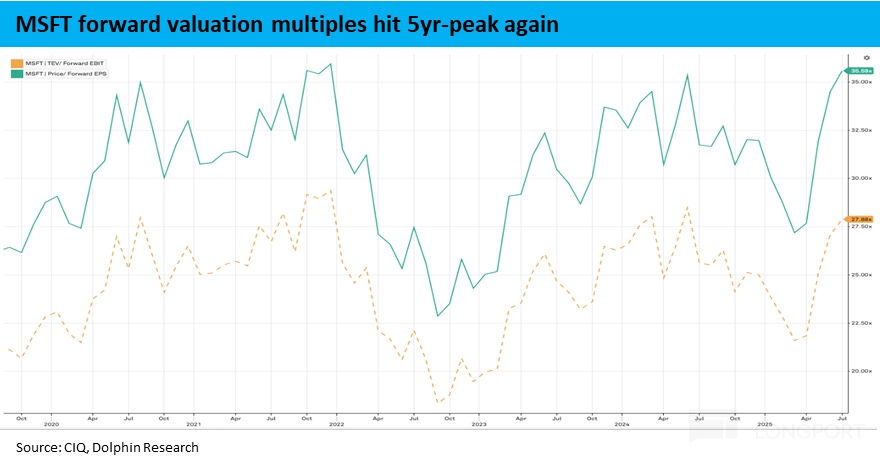 我們直接按2年後27財年的業績為基準,按照海豚相對樂觀的利潤預期(比市場一致預期高10%左右),微軟業績前市值對應約30x PE。即便從這個角度看,微軟的估值仍算不得便宜,無疑包含市場對微軟在這輪AI浪潮中受益確定性所給出的溢價。