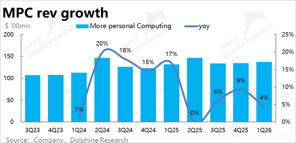 在完全渡過了並表動視暴雪的影響期後,更多個人計算板塊的增長開始回歸常態。本季度營收增長4%,沒有公司先前指引的會負增長那麼差。但維持在低個位數的增速,意味著仍沒有值得特別關注之處。