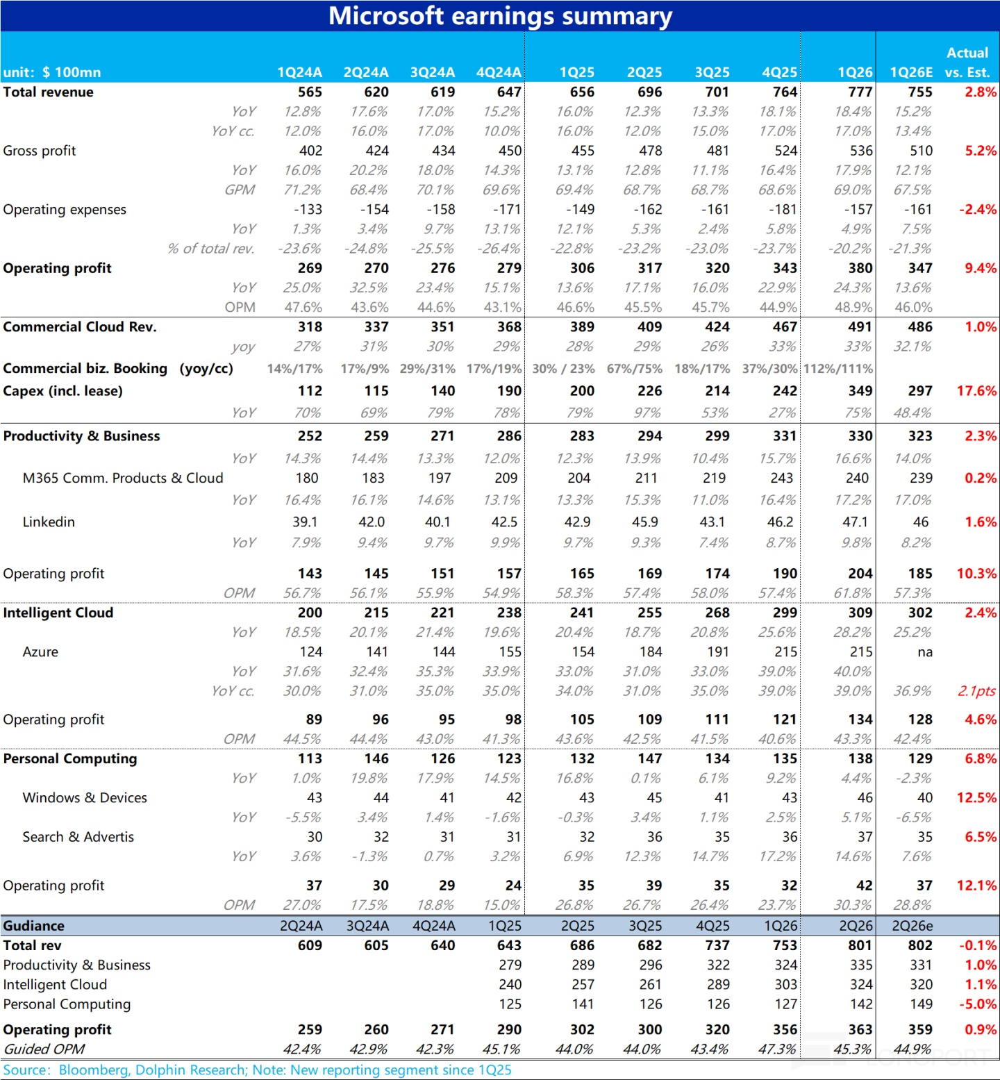 匯總上述各板塊表現,微軟集團整體本季度營收$777億,同比增長18%,趨勢上相比上季大體平穩、略微有提速,但相比公司上季給出的指引和彭博一致預期的15%,是明顯超預期的。