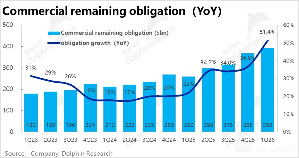 不過,雖然前瞻指標看起來非常強勁,但也是主要歸功於OpenAI和Azure簽訂的大額承諾合同(不包括幾天前簽訂的$2500億承諾)。考慮到OpenAI四處簽訂框架性的大訂單,但自身當前造血能力有限對中長期内這些訂單能否實際完全轉化,海豚還是保持一定謹慎,不能「太當回事」。